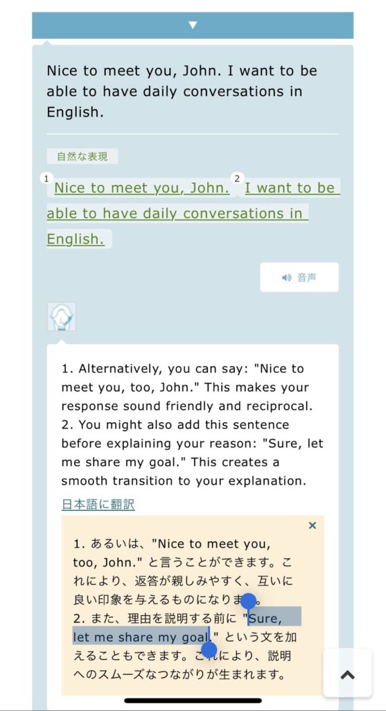 こんな感じで、自分で作文した英文に添削がされて、こっちの表現の方がいいよみたいなことを書いてくれたりします。